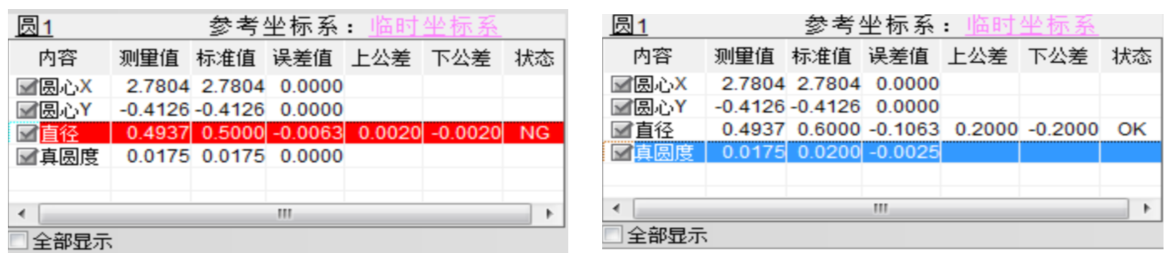 软件提供完整的公差设定和计算功能,可设定和计算形位公差如直线度,圆度,平面度、圆柱度,轮廓度、位置度、平行度、垂直度、同心度、圆跳动等。并自动判别公差是否OK或NG,并具备NG示警及提示功能。形象化的公差图表使用户获知具体超差位置,方便查找超差原因。