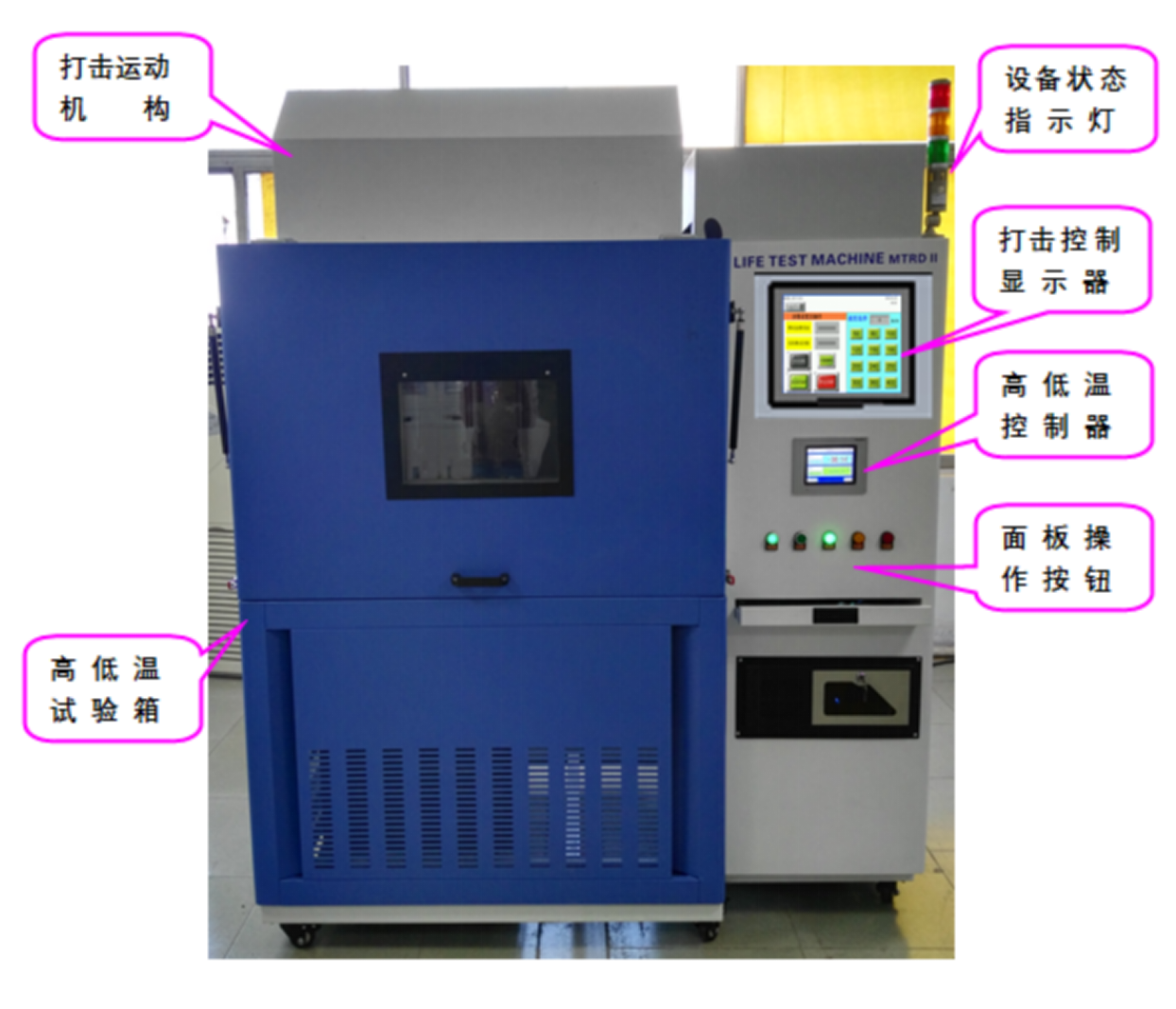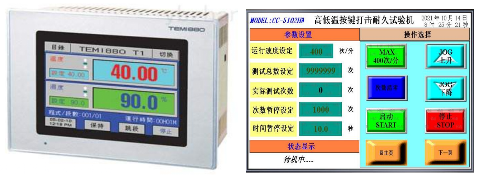 本机适用于计算机键盘、Notebook、按键开关、计算器键盘、导电橡胶按键、金属弹片按键(俗称锅仔)或同类型按键置于高低温环境箱内的打击寿命老化试验,采用先进的PLC触膜屏控制键盘按键寿命试验全过程。同时适用于硅橡胶类按键作疲劳测试;具有速度可调,次数任意设定及同时测试数个产品(每个产品均可多点测试),到达次数或停电停机后保持数据;恢复来电后可依据之前数据继续运行。每个测头可以设定不同压力及不同高度。
