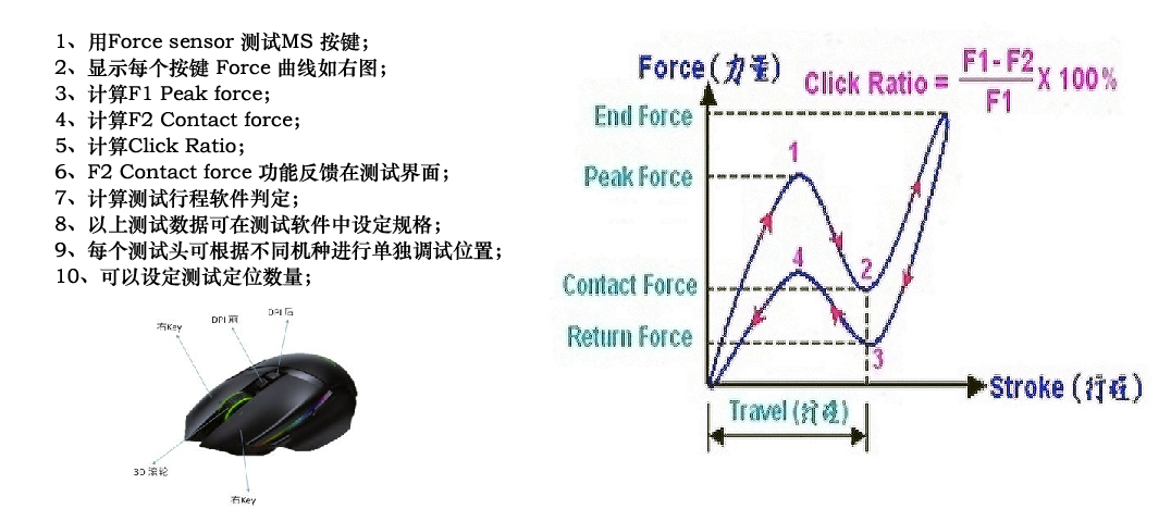 鼠标性能测试机用于电竞鼠标按键全方位自动翻转在线测试,通过人工上下料将产品置入待测区,产品归置完毕后,软件执行测试动作,动作结束,产品测试结果状态数据颜色标记显示,若测试状态OK,继续下个鼠标按键测试,若中途出现NG产品,测试项数据对应位置红色高亮显示。鼠标点位测试完毕之后,将会对整个测试点位数的结果进行综合判定。